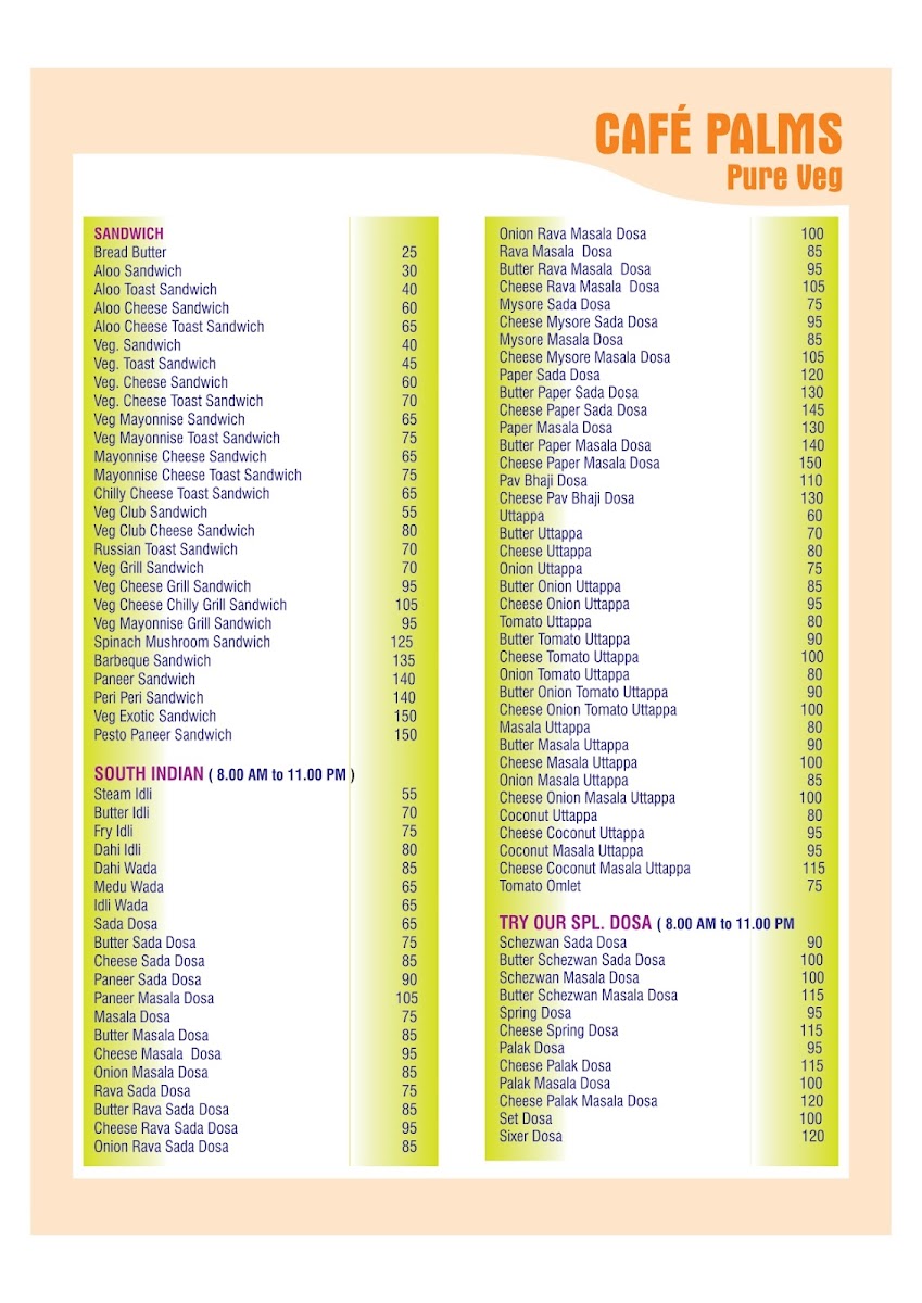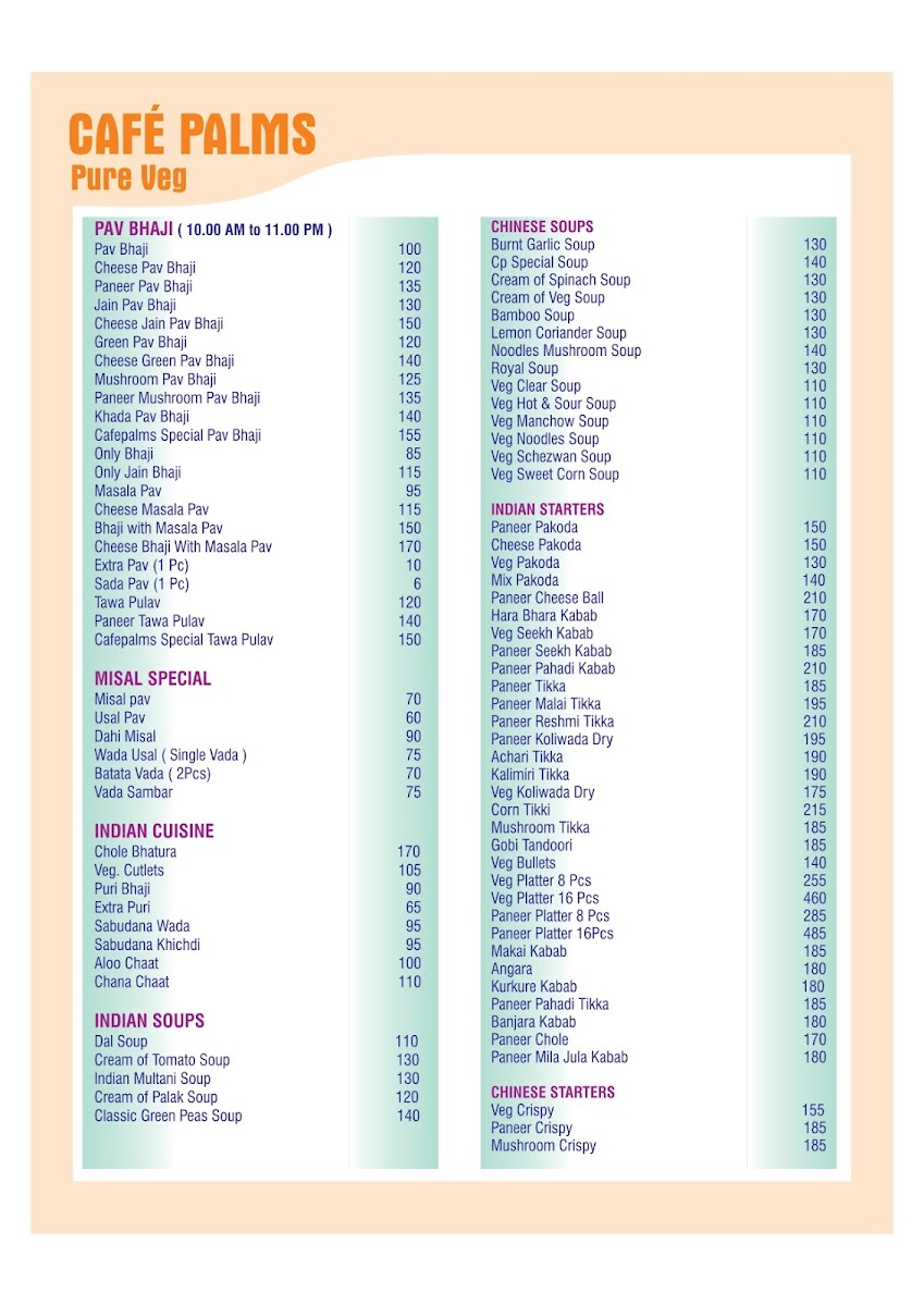 Introducing the menu at Cafe Palms - Restaurant & Banquet Hall is a journey through delightful flavors and vibrant cuisines. Nestled in Bhandup East, this charming cafe and banquet hall caters to a diverse palate with its tempting array of options, perfect for casual dining and elegant affairs alike.